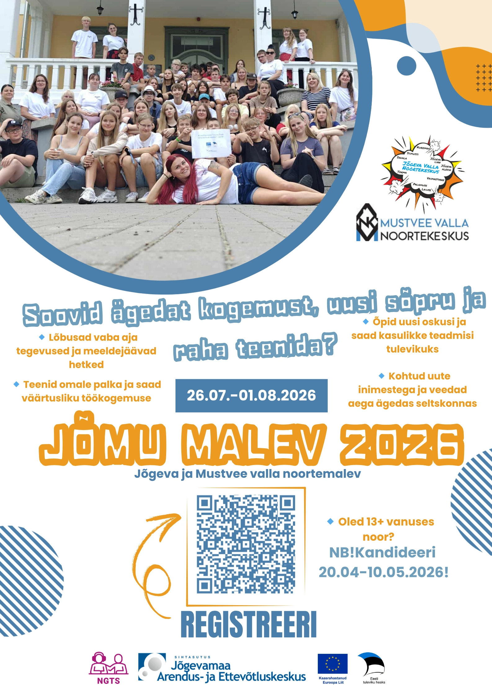 2026. aasta õpilasmalev toimub 26.07-01.08.2026 Jõgeva vallas. Malev annab võimaluse saada esimene või järgnev töökogemus toredas seltskonnas. Pärast tööpäeva toimuvad põnevad ühised tegevused.
